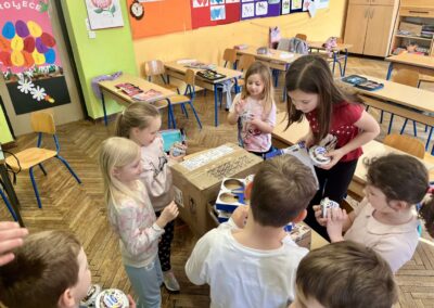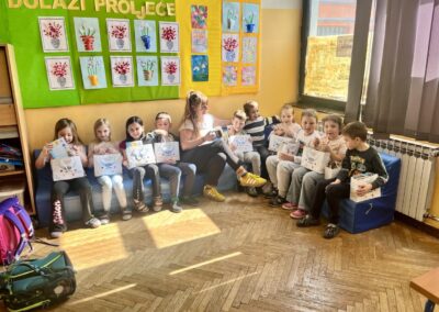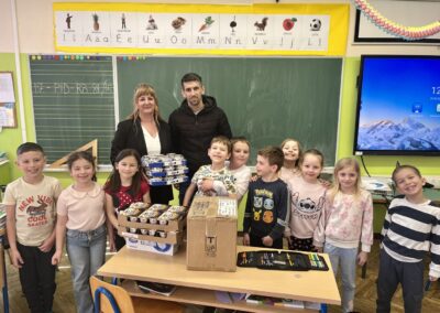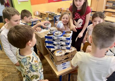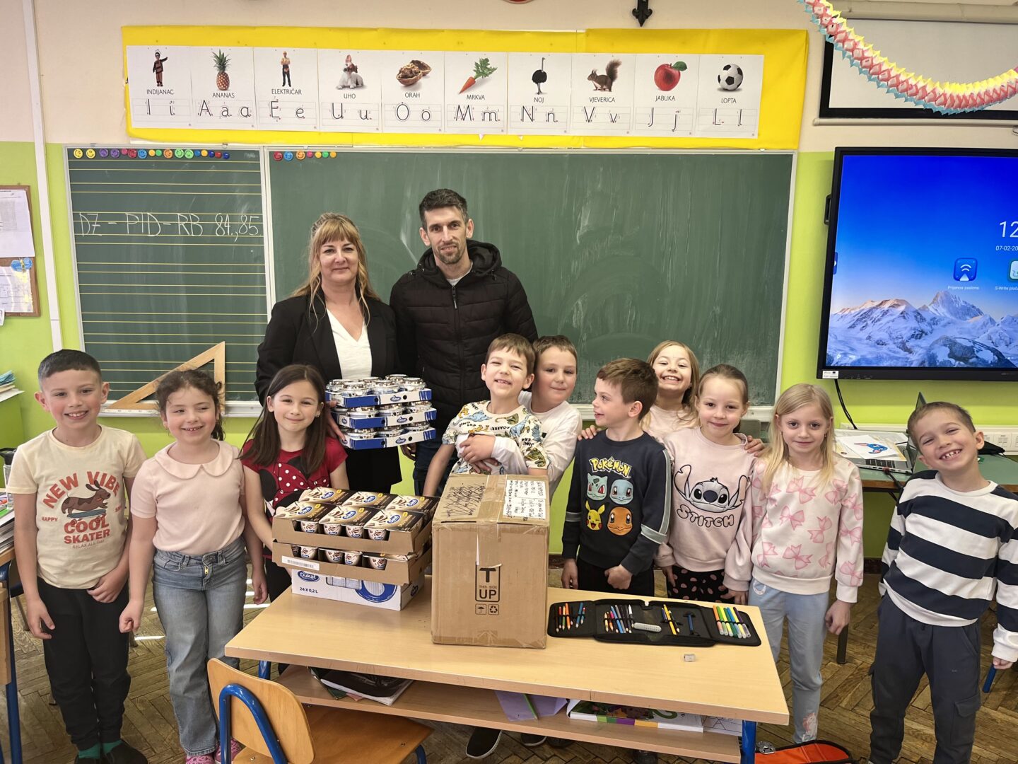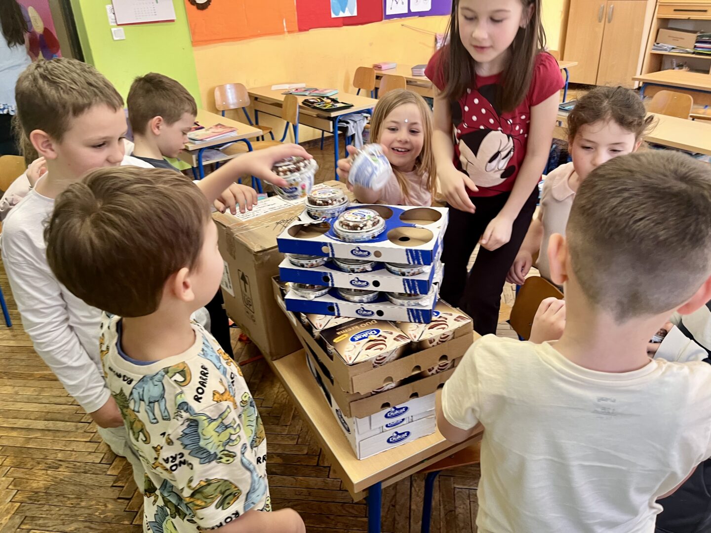 Veliko hvala Dukatu koji je razveselio cijeli razred – učenici su dobili šalice s otisnutim Lovrinim radom, čokoladna mlijeka, pudinge, desertne jogurte, bojice i kalendare.