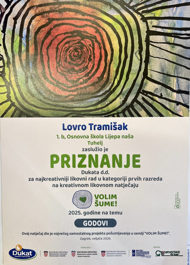 Ponosni smo na Lovru i njegov uspjeh, ali i na zajedništvo i radost koju je podijelio sa svojim razredom. Lovrin likovni rad pobjedio je u kategoriji učenika 1. prvih razreda u konkurenciji 16 000 pristiglih radova.